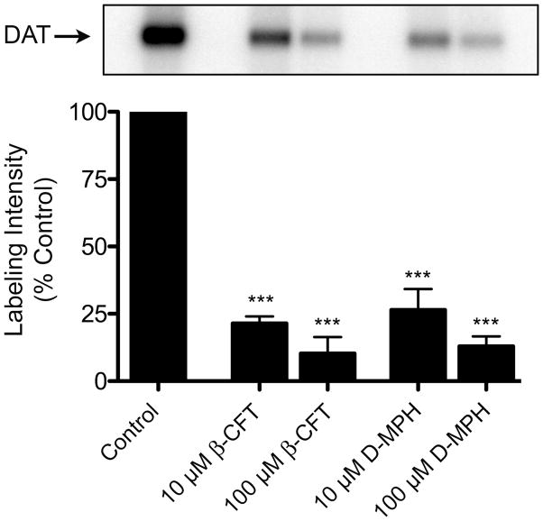 Photoaffinity labeling of DAT with [125I]-(±)-3a. Rat striatal membranes were photoaffinity labeled with 30 nM [125I]-(±)-3a in the absence or presence of 10 μM or 100 μM β-CFT or D-MPH. Membranes were solubilized and DATs were immunoprecipitated followed by analysis by SDS-PAGE and autoradiography. The relevant portion of a representative autoradiograph is pictured followed by a histogram that quantitates relative band intensities. Mean ± S.E. of three independent experiments is shown; ***, p < 0.001 vs. control.
