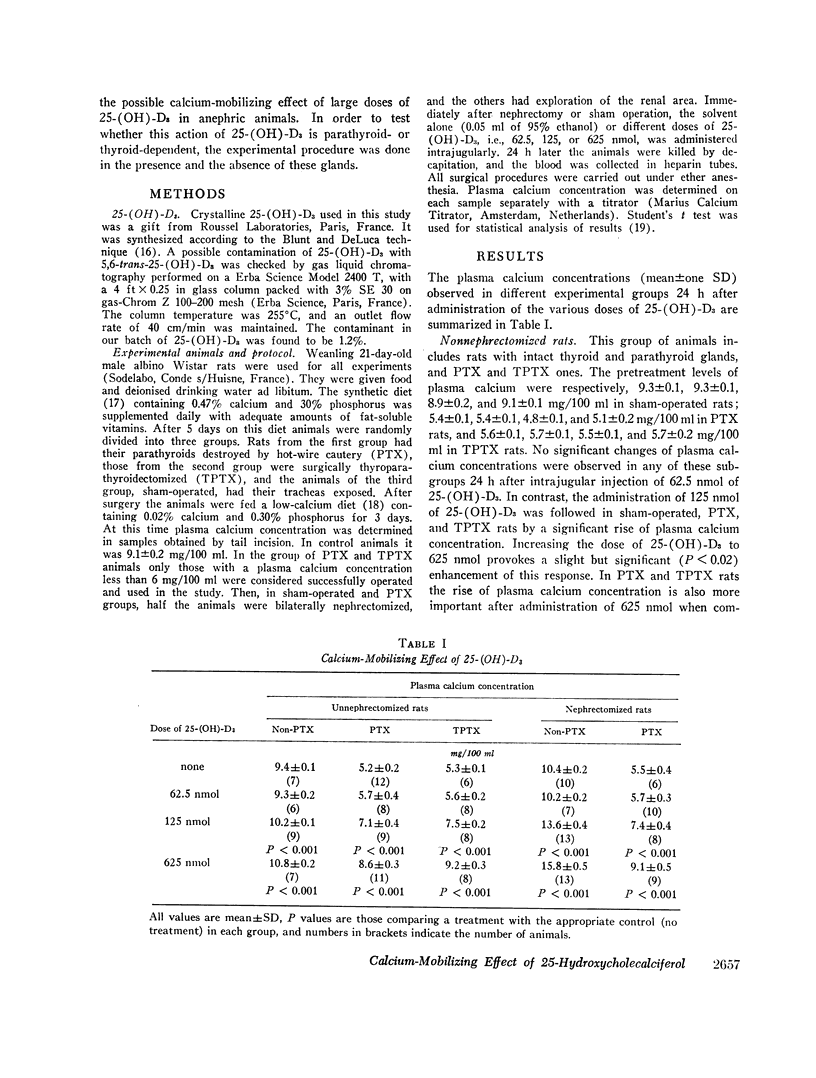 The effect of high doses of 25-hydroxycholecalciferol on plasma calcium concentration was studied in rats receiving a low-calcium normal vitamin D diet. In bilaterally nephrectomized animals, as in sham-operated controls, 62.5 nmol of 25-hyroxycholecalciferol did not produce a rise of plasma calcium concentration. In contrast, the administration of 125 or 625 nmol, doses 1,000-5,000 times the minimal active dose in D-deficient rats, was followed in both groups of animals by a significant increase of plasma calcium concentration. Removal of either parathyroids alone or parathyroid and thyroid glands did not suppress this effect. These data suggest that when large doses are used in vivo, the renal conversion of 25-hydroxycholecalciferol to more polar metabolites is not an obligatory step for its calcium-mobilizing action. The present study does not elucidate, however, the exact mechanism(s) of this effect.