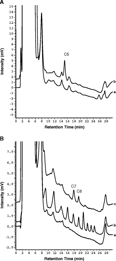 Three 100 mL water samples were preconcentrated on Sep-Pak C18 columns with flow rate 1 mL min−1. Analytes were eluted with 5 mL methanol and evaporated in argon atmosphere. Solid residues was dissolved in 1 mL ACN, and 0.7 mL solution was used for 1 h derivatization at 70 °C with 2 g L−1 solution of 3-BrAC.