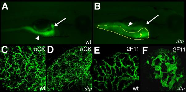 Procedures for mutagenesis and screening for dtp are reported (30). Wild-type TLF strain fish were used for all morpholino injections and drug treatments. Fish were cared for in accordance with the Institutional Animal Care and Use Committees of both The Children’s Hospital of Philadelphia and the University of Pennsylvania.