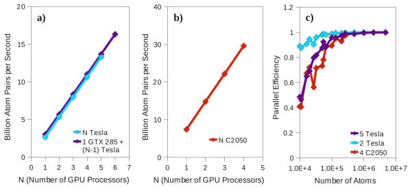 The parallel efficiency as a function of system size can be seen in Fig. 6c. Three cases are shown: running on all five Tesla GPUs of the 6×G200 machine, running on only two Tesla GPUs of the same machine, and running on the entire 4×C2050 machine. When only two Teslas are employed, greater than 90 percent parallel efficiency is achieved down to the 16,000 atom system. In the 5×Tesla and 4×C2050 cases peak performance is approached more slowly, with 90 percent parallel efficiency surpassed at approximately 100,000 and 130,000 atoms, respectively.
