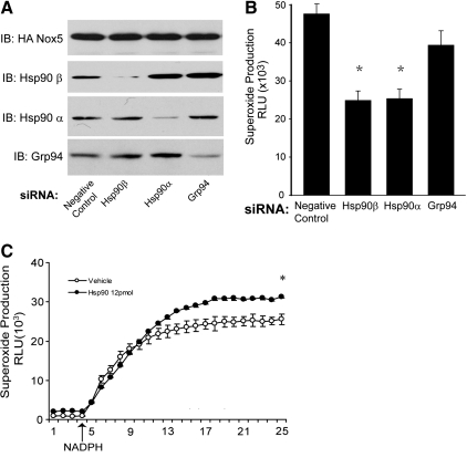 To support the pharmacological findings shown in Figure 1, we next tested whether transient knockdown of Hsp90 gene expression could influence the activity of Nox5.