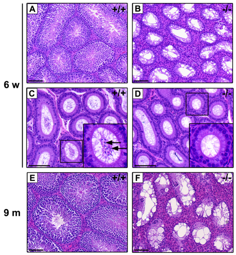 Sterility of RanBPM−/− males. (A-D) Hematoxylin and Eosin (H&E)-stained sections of testis (A,B) and epididymis (C,D) from wild-type (+/+; A,C) and knockout (−/−; B,D) 6-week-old (6 w) mice. Mutant seminiferous tubules are almost totally devoid of germ cells (B) and spermatozoa are absent in the mutant epididymis (D). Insets show enlarged views of the boxed areas in C and D. Spermatozoa are indicated by arrows. (E,F) At 9 months (9 m) mutant tubules (F) are completely degenerated compared with wild type (E). Scale bars: 100 μm.