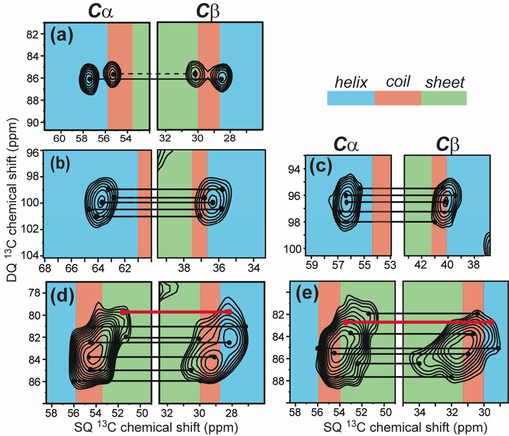 Amplified Cα-Cβ regions of the INADEQUATE spectra. (a) Arg · HCl at 296 K. (b) Ile35 of viral-membrane bound M2TM at 238 K. (c) Leu26 of viral-membrane bound M2TM at 238 K. (d) Arg8 of TAT in POPE/POPG bilayers at 238 K. (e) Lys4 of TAT in POPE/POPG bilayers at 238 K. Helix, coil and sheet chemical shift regions are shaded in blue, red and green, respectively. Selected correlated Cα-Cβ positions are connected by lines to guide the eye. Sheet-helix chemical shift correlations are colored by red lines.