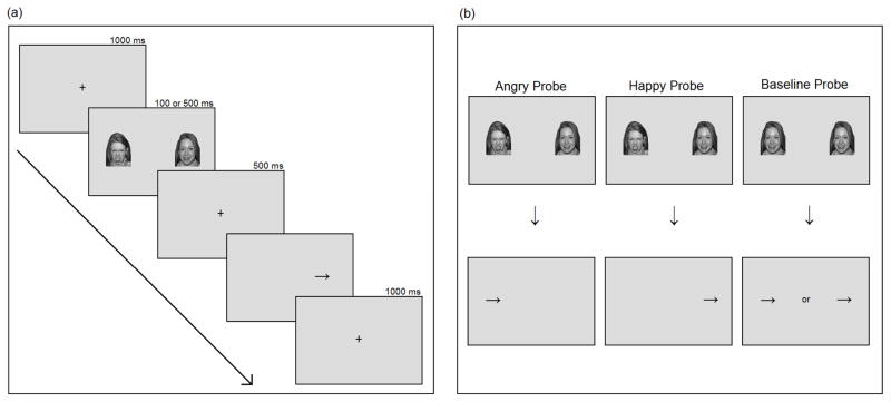 Stimuli were programmed using E-Prime version 1.1 (Schneider, Eschman, & Zuccolotto, 2002). Figure 1a displays the sequence of events for a trial of the dot probe task. Each trial begins with a fixation cross presented for 1000 ms, followed by a pair of cue stimuli (emotional faces) for either 100 or 500 ms. Face pairs were either angry-happy faces, happy-angry faces, or happy-happy faces. Each type of pair was presented an equal number of times so that angry and happy faces were equally presented on either side of the screen. An angry face probe is when the target replaces the angry face from a pair of angry and happy faces, while a happy face probe is when the target replaces the happy face from a pair of angry and happy faces. A baseline probe is when the target replaces either face from a pair of two happy faces (see Figure 1b). Face images subtended 7 cm ×10 cm and were presented equal distance to the right and left of the fixation cross. After the faces were removed a 500 ms delay occurred, followed by a probe (arrow) in the location previously occupied by one of the faces. Participants were asked to respond as quickly and as accurately as possible whether the arrow was pointing to the left or the right by clicking on the mouse. The inter-trial interval was 1000 ms.