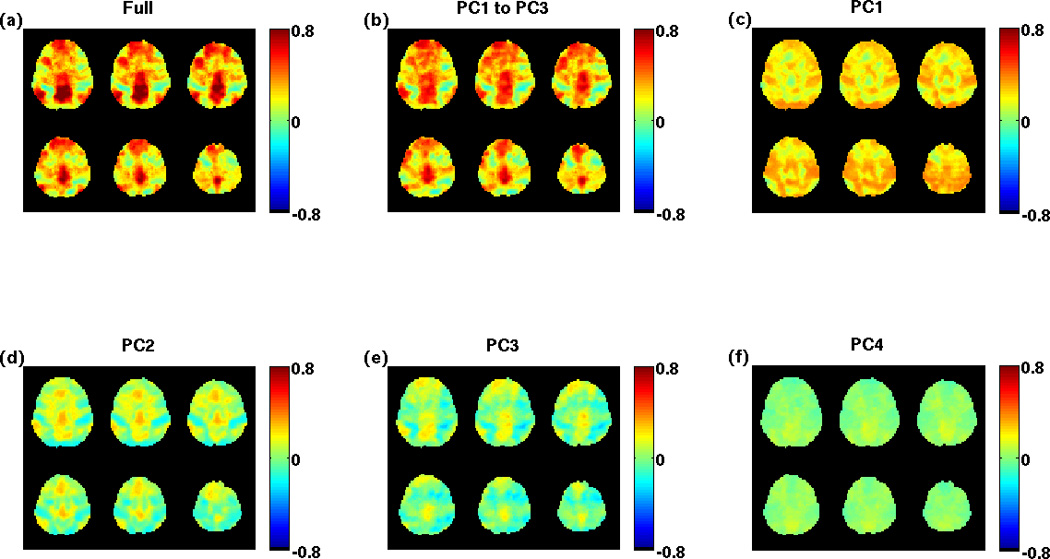 To demonstrate the decomposition of a correlation map, Figure 1a shows a full (i.e. using all components) correlation map obtained using a seed signal from the PCC region with maps of the top 3 correlation components shown in Figures 1c through 1e, i.e. for k ranging from 1 to 3 with the modified ranking scheme. (As there was space in the plot, the 4th component is also shown.) The correlation map associated with the first component (PC1) represents the correlation with the component that is similar to the global signal. A low dimensional approximation to the full correlation map using the sum of the top 3 components is shown in Figure 1b (obtained using Equation 3 with K = 3). It exhibits a high degree of similarity to the full correlation map in Figure 1a. Supplementary Figure 1 provides additional examples of the decomposition for a representative slice and run from each subject