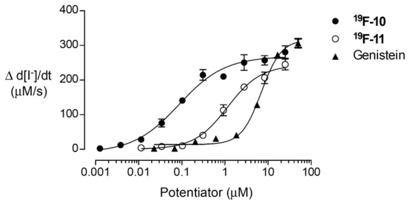 The ΔF508-CFTR potentiator activity of 19F-10 and 19F-11 was assayed in FRT cells co-expressing ΔF508-CFTR and YFP-H148Q/I152L after rescue of ΔF508-CFTR by 24 h culture at 27 °C.11,12 Fluorinated phenylglycine analogs had EC50 of 0.09 μM (19F-10) and 1.1 μM (19F-11), comparable to that of 0.3 μM reported previously for PG-01,10 and much better than that of 7.0 μM for benchmark potentiator genistein (Figure 5).