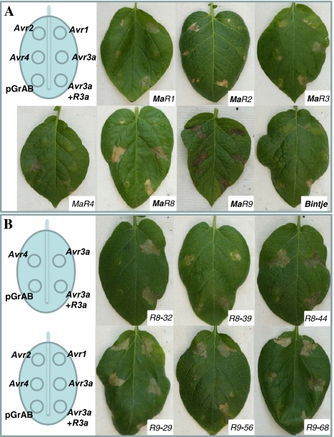 Fifteen days after transfer into the greenhouse, F1 population plants derived from MaR8 and MaR9 and their controls were used for agroinfiltration experiments with Avr1, Avr2, Avr3a, and Avr4. Safety regulations for containment determined the use of a separate greenhouse compartment for agro-treatments. 3, 5, and 7 days after agroinfiltration, symptoms which are caused by the interaction between R genes and the corresponding Avr genes were observed and scored. Agroinfiltration assay followed previously described methodology (Vleeshouwers et al. 2008).