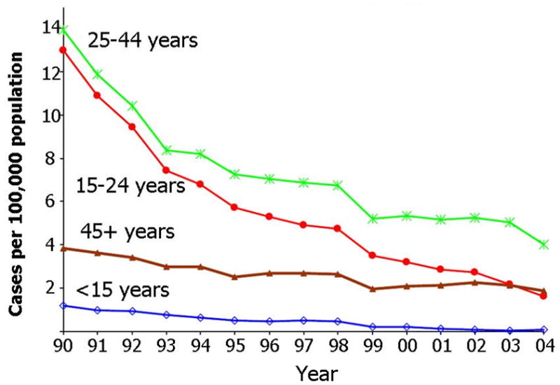 Based on data from CDC, the incidence of acute hepatitis B in the United States has declined steadily since the late 1980s.6 Between 1987 and 2004, the incidence of acute hepatitis B declined 80%, from 10.7 per 100,000 (25,916 cases reported) to 2.1 per 100,000 (6,212 cases reported).7 Figure 1 summarizes acute hepatitis B incidence by age group. The highest incidence of acute hepatitis B has been seen among persons 25–44 years of age (4.0/100,000 persons in 2004) and the lowest among children less than 15 years of age (0.1/100,000 in 2004). Over time, the incidence decreased in all age groups with the greatest proportional decline occurring among age groups <15 years (95% decline) and 15–24 years (87% decline). Although less dramatic, substantial decreases were also seen among older persons with a 71% and 51% decrease in rates observed for 25–44 year-old and 45+ year-old groups respectively. In general, the incidence of acute hepatitis B is higher in men than in women (2.7/100,000 versus 1.6/100,000 in 2004).