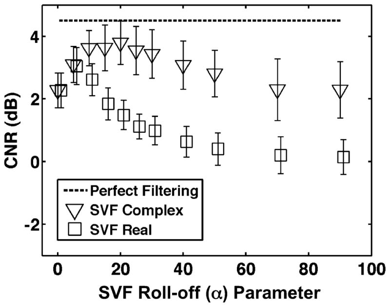 CNR when SVF operated on complex or real echo data for varied values of the SVF weighting function roll-off (α) parameter. Open symbols represent mean and error bars represent standard deviation over 100 trials. Default simulation parameters are listed in Table II.