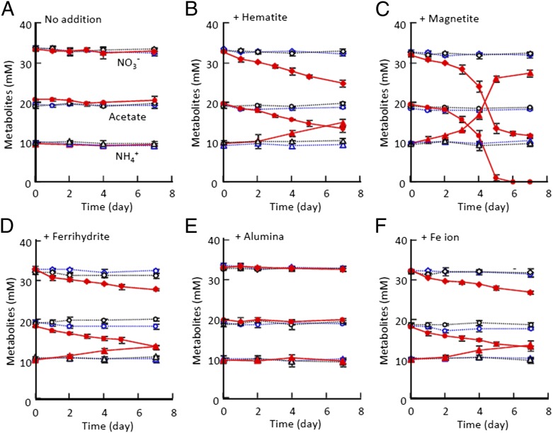 Changes in substrates and metabolites in single cultures of G. sulfurreducens (blue dashed lines), single cultures of T. denitrificans (black dashed lines), and their cocultures (red solid lines) in the absence (A) and presence (B–E) of different mineral species (indicated above the graphs) or in controls supplemented with Fe ion (F). Changes in concentrations of nitrate (diamonds), acetate (circles), and ammonium (triangles) are shown. Data points represent means of three independent cultures; error bars indicate SDs.