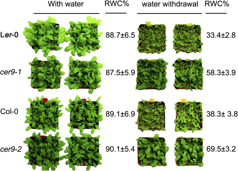 Both cer9-1 and cer9-2 are more resistant to drought stress compared with the corresponding wild-type Ler-0 and Col-0, respectively. The percentage relative water content (RWC%) shown for each representative plant is the average of 10 plants.