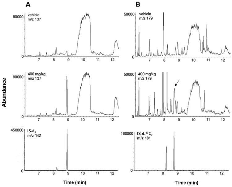 SIM chromatograms of methylthio-PEs generated by alkaline permethylation of blood samples obtained from CD-1 mice treated with vehicle or styrene (400 mg/kg dose for 5 days). (A) 2-methylthio-2-PE (m/z 137) with internal standard IS-d5 (m/z 142). (B) 2-methylthio-1-PE (m/z 179) with internal standard IS-d1 13C2 (m/z 181).