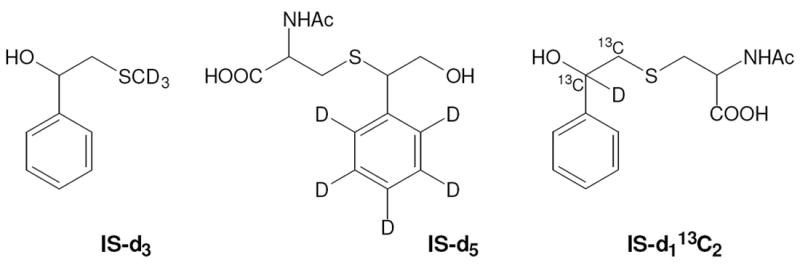 The qualitative and quantitative analysis of alkaline permethylation products was performed on gas chromatography-mass spectrometry (GC/MS) (Agilent Technologies, Palo Alto, CA), including a HP 5890 series II gas chromatograph, HP 5971A mass selective detector, and HP 59940A MS ChemStation (HP-UX series) controller. An Agilent J&W Scientific DB-5MS 20 m × 0.18mm ID × 0.18 μm GC column was used for the analysis. The injector was in splitless mode (1 min. hold) with 10 μL injection volume at an inlet temperature of 250 °C. Helium was used as the carrier gas set at constant flow 0.49 ml/min. The oven program had an initial temperature of 60 °C, then immediately ramped at 20 °C/min to 250 °C (hold for 2 min). The mass spectrometry data were acquired in selective ion monitoring (SIM) mode. The filament delay was set at 6.0 min. This gave a total run time of 12.5 min. The peak areas were integrated in SIM chromatograms with styrene glycol: m/z 179; 2-methylthio-2-PE: m/z 137; and 2-methylthio-1-PE: m/z 179; IS-d3: m/z 179; IS-d1 13C2: m/z 181; IS-d5: m/z 142 (refer to Scheme 2 for structures of internal standards IS-d3, IS-d1 13C2, and IS-d5).