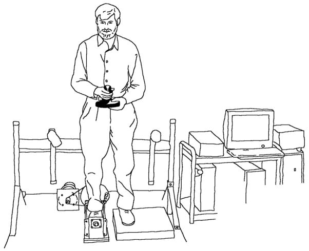 Subject standing on a force plate inverting and everting the ankle as quickly as possible (a) and as far as possible (b) so as to determine ankle rate of torque generation and maximum voluntary strength, respectively.