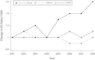 Note. ED = emergency department. Rates/1000 for years 2001 and 2008 were 3.7 and 5.9, respectively, for dental visits; 9.1 and 9.1, respectively, for asthma-related visits; and 377.1 and 406.6, respectively, for all ED visits.