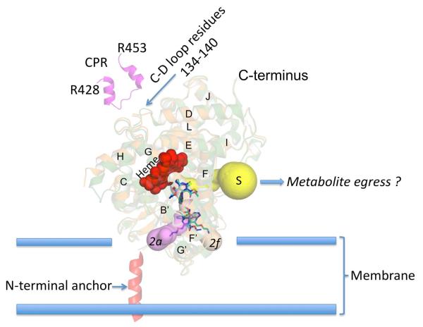 The substrate access or exit channels that connect the protein surface to the deeply buried active site have been defined previously in several P450s using X-ray crystallography and molecular dynamics (MD) studies. The structure of P450 2C8 revealed channels on either side of helix B’ extending to the solvent from the buried active site (17), while the P450 2E1 structure described the channel location between the B-B’ loop, the β1 sheet system, and beneath the F’ and G’ helices (18). However, in the vitamin D 25-hydroxylase P450 2R1 structure, vitamin D3 enters the active site via a channel between the G and I helices, the B’ helix and the B-C loop (19), whereas helices B’, F and the β1 sheet region form such an access channel in the cholesterol hydroxylase P450 46A1 structure (20). In addition, the recent structural analysis of Cyp51 revealed substrate access channels near the F-G loop, A’ helix, and β4 loop (21). It is noteworthy that MD simulations on P450 2C9 and P450 3A4 demonstrated opening and closing of several putative substrate access and exit channels (22, 23). Knowledge of substrate access/egress channels was advanced substantially by recent structure determination of dual ligand complexes of P450 24A1, P450 101D2, P450 21A2 and P450 2A13 (24-27). The second ligand molecule was located at a distal site in a channel extending to the protein surface near the B-B’ loop, β1 sheet, and F-G loop in P450 24A1; B’, F/G helices and F-G loop in P450 101D2; between loops β1/β2, β3/β4, and helix F’ in P450 21A2; and close to the β4 sheet system, above K’-L loop in P450 2A13. Accordingly, the existing evidence suggests that the diversity of substrate access channels results from intrinsic differences in the P450s as well as structural differences among the substrates.