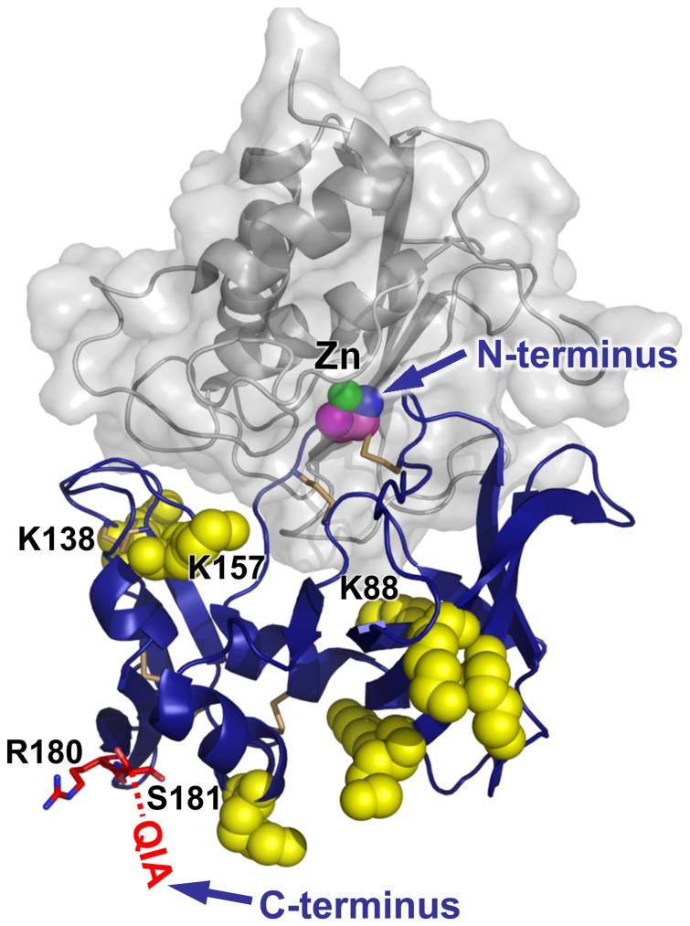 TIMP-1 (blue) is shown binding to the MMP-3 catalytic domain (gray); the N-terminal Cys-1 backbone (magenta and blue spheres) coordinates directly to the MMP catalytic Zn (green). The C-terminal residues Arg-180, Ser-181, Gln-182, and Ala-184 (red sticks; residues 182–184 unstructured in the crystal structure) were initially mutated to Cys and targeted for site-specific PEGylation. In a subsequent approach, the 8 natural Lys residues (yellow spheres) were targeted for PEGylation. Lys-138, Lys-157 and Lys-88 all lie within 10 Å of the MMP-3 cd, while other Lys residues are distant from the binding interface. Structure coordinates are from PDB ID 1UEA [44]; figure was created using PyMOL.