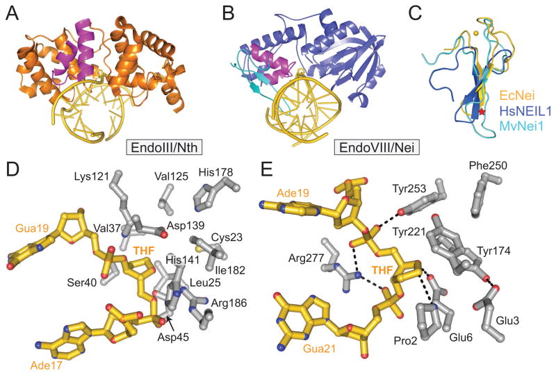 EndoIII/Nth and EndoVIII/Nei. (A) Bacillus stearothermophilus Endonuclease III (BsEndoIII) (PDB ID 1P59) bound to THF-DNA (gold). The THF moiety and iron-sulfur cluster are shown as sticks in the center and right side of the figure, respectively. The HhH DNA binding motif is magenta. (B) Mimivirus NEIL1 ortholog MvNei1 (3A46) bound to THF-DNA (gold). The H2TH motif is colored magenta and the zincless finger is cyan. (C) Overlay of the zinc finger from Escherichia coli Endonuclease VIII (EcNei) (1K3W) (gold) with zincless finger motifs from human NEIL1 (1TDH, blue) and MvNei1 (cyan). The zinc ion in EcNei is depicted as a gold sphere. A red star denotes the general location of arginine residues that contact the DNA. (D) Active site of BsEndoIII (grey) bound to THF-DNA (gold). (E) Active site of MvNei1 bound to THF-DNA.