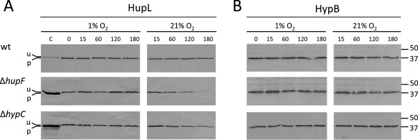 HupF is a HypC paralogue with a similar predicted structure, except for the C-terminal domain present only in HupF. Deletion of hupF results in the inability to process the hydrogenase large subunit HupL, and also in reduced stability of this subunit when cells are exposed to high oxygen tensions. A ΔhupF mutant was fully complemented for hydrogenase activity by a C-terminal deletion derivative under symbiotic, ultra low-oxygen tensions, but only partial complementation was observed in free living cells under higher oxygen tensions (1% or 3%). Co-purification experiments using StrepTag-labelled HupF derivatives and mass spectrometry analysis indicate the existence of a major complex involving HupL and HupF, and a less abundant HupF-HupK complex.