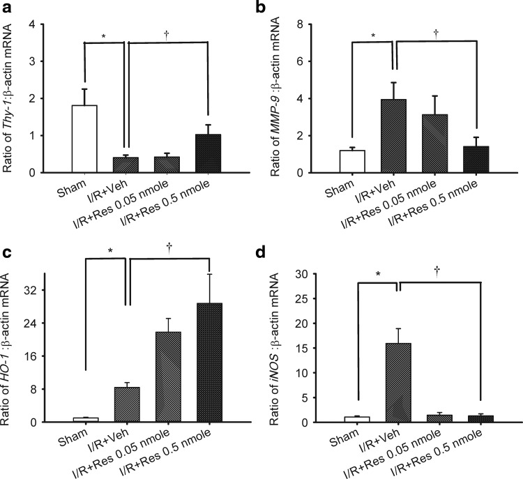 Real-time polymerase chain reaction analysis of the expression of Thy-1 (a), MMP-9 (b), HO-1 (c), iNOS (d), and β-actin. Twenty four hours after ischemia plus reperfusion (I/R), whole retinal extracts were isolated from the sham procedure eyes (control) or the ischemic eyes (subjected to 60-min high intraocular pressure) preadministered (15-min before ischemia) with intravitreous vehicle (ethanol) or resveratrol (0.05 nmole; 0.5 nmole). The effect of either treatment on the ratio of Thy-1/MMP-9/HO-1/iNOS: β-actin mRNA was determined compared to the control, which is β-actin and is a housekeeping gene. */† represent significant differences (P<0.05) between the vehicle-pretreated ischemic group and the sham procedure group and significant differences (P<0.05) between the vehicle-pretreated ischemic group and the resveratrol-pretreated ischemic group, respectively. MMP-9, matrix metalloproteinase-9; HO-1, heme oxygenase-1; iNOS, inducible nitric oxide synthase; Res, resveratrol. The results are the mean±SEM (n=5).