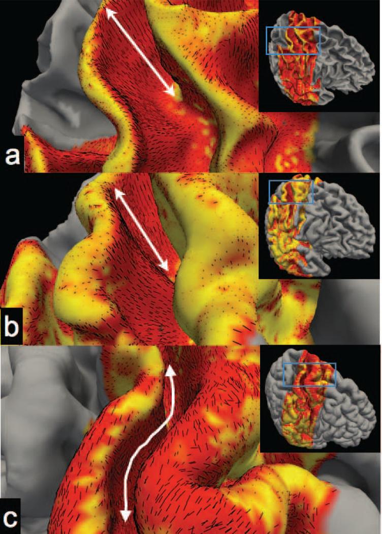 The tangential component of the primary eigenvector of the diffusion tensor (represented as yellow lines) superimposed on the radiality plots on the curved cortical surfaces for a) the interface of the white matter and the cortex, b) the middle cortical depth and c) the pial surface. Double-sided arrows highlight the dominant orientation of the vector field, i.e. between the crown and the fundus for a) and b) and along the length of the fundus and crown for c).