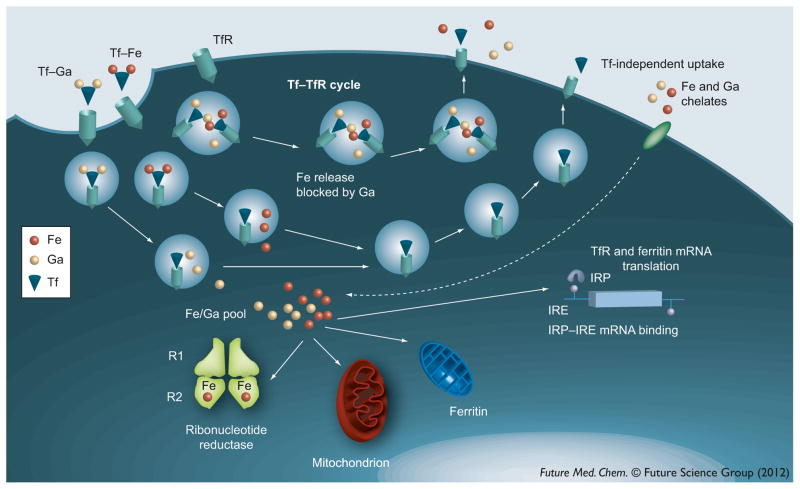 Iron(III) and gallium(III) are taken up by cells via transferrin receptor-mediated endocytosis of transferrin–iron (Tf–Fe3+) and transferrin–gallium (Tf–Ga3+). These complexes compete with each other for binding to the cell surface TfR. Theoretically, the endosome can contain Tf-Fe3+ or Tf-Ga3+, or both Tf-Fe3+ and Tf-Ga3+ in variable proportions. Fe3+ and Ga3+ are unloaded from transferrin in an acidic endosome and transferred to an intracellular labile pool containing both iron and gallium. However, gallium may also block the unloading of iron from the endosome, thus resulting in recycling of both metals back to the cell surface to be released to the exterior. In some cells, iron and gallium may enter cells through a transferrin-independent route. Under physiological conditions, the iron in the pool is utilized for ribonucleotide reductase activity, mitochondrial function and other iron-dependent processes. Excess iron(III) is stored in ferritin. Transferrin receptor and ferritin syntheses are regulated by cellular iron status via the interaction of IRP with IREs present on the 5′ or 3′ untranslated regions of the ferritin or transferrin receptor mRNAs, respectively. Gallium can disrupt cellular iron homeostasis and inhibit cell proliferation through action on iron-dependent processes at different levels.