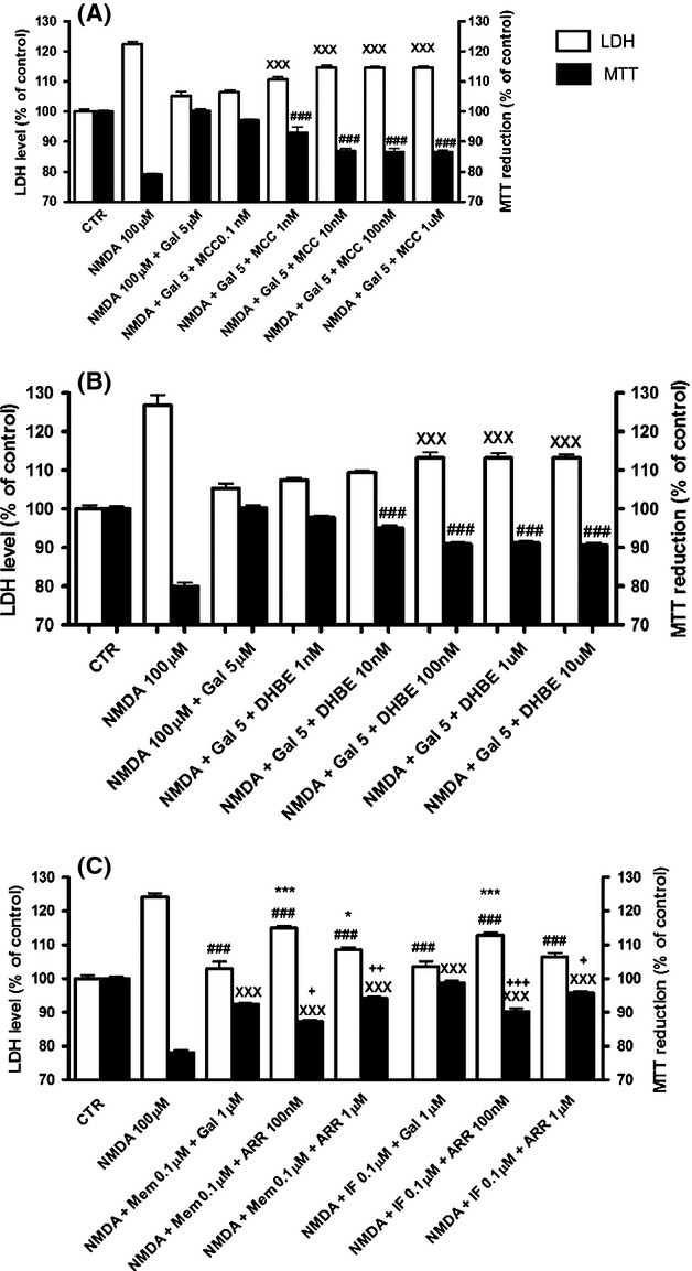 After 14 days in vitro, neurons were exposed to appropriate concentrations (see Figs. 1–4) of NMDA alone or in coadministration with memantine, ifenprodil, MK-801, galantamine, MCC citrate, DHBE hydrobromide, and ARR hydrochloride, separately or in different combinations. The duration of the treatment was 3 h.