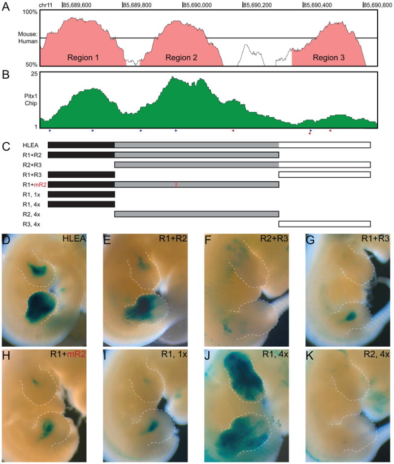 Pitx1 binding highlights functionally important subdomains of HLEA. (A) Conservation plot comparing the sequence identity between mouse and human HLEA reveals three regions of conservation. Aligned regions of at least 10bp and ≥70% sequence identity are shaded in pink (B) Pitx1 ChIP-seq signal across HLEA. The y-axis indicates the number of sequence tags per ten million reads. The position and orientation of sequences that match Pitx1 binding motifs are denoted by blue and red arrowheads. (C) Schematic of HLEA subregions tested for enhancer activity via Hsp68LacZ transgenes. (D–K) Representative whole-mount LacZ stained mouse embryos carrying different HLEA transgenes. Forelimbs and hindlimbs are outlined in white.