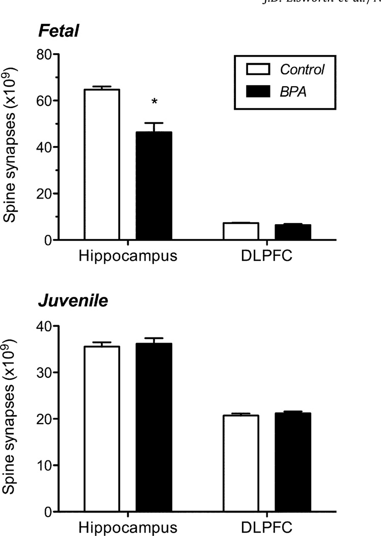 A significant loss of spine synapses in hippocampus, but not prefrontal cortex, was observed following exposure in utero to BPA. In contrast, no effect of BPA on spine synapses was detected in hippocampus or DLPFC in juvenile monkeys. Unlike the hippocampus, the primate prefrontal cortex is undergoing significant developmental reorganization until early adulthood (Eckenhoff and Rakic, 1984; Giedd et al., 1999; Petanjek et al., 2011), so it is possible that the relative immaturity of the region enabled the fetal DLPFC to escape from a BPA-induced synaptic effect. The demonstrated marked effect of BPA on hippocampus spine synapses during development suggests a potential impact of BPA on mnemonic processes in the exposed offspring.