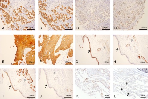 Typical immunohistochemical staining patterns are shown. Cytokeratin 7 was overexpressed in cytoplasm of ADs (A) and non-neoplastic tissues (H and K, both black and gray arrows). Cytokeratin 18 was overexpressed in cytoplasm of ADs (B) and non-neoplastic tissues (I and L, both black and gray arrows). Cytokeratin 19 was low expressed in cytoplasm of ADs (C) and non-neoplastic airway epithelial cells (J, black arrow) and tracheal glands (J, gray arrow). Thyroid transcription factor-1 was overexpressed in nuclei of ADs (D). Cytokeratin (CK) 5/6 was overexpressed in the cytoplasm of squamous cell carcinoma (SQ) cells (E) and in non-neoplastic airway epithelial cells (G, black arrow) and low expressed in non-neoplastic tracheal glands (G, gray arrow). Cytokeratin 14 was overexpressed in cytoplasm of SQs (F).