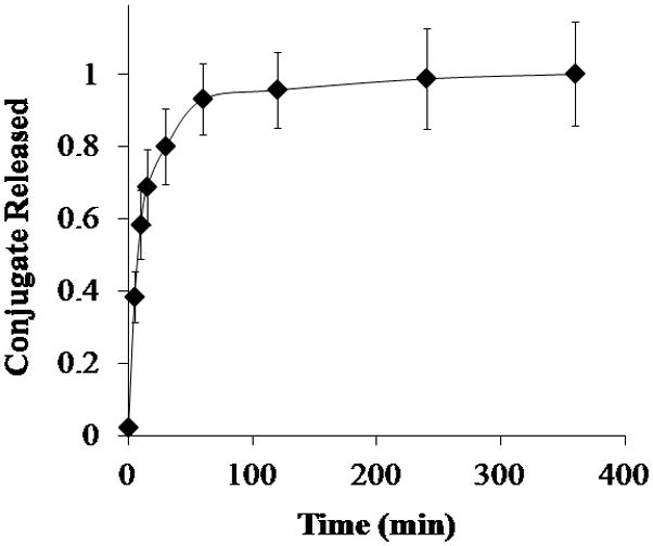 The inulin-doxorubicin conjugate was loaded into P(MAA-g-EG)-5.0NP microparticles by equilibrium partitioning and the loading efficiency was determined to be 54 ± 2.0%. The weight percent loading, defined as the mg of inulin-doxorubicin conjugate per mg of P(MAA-g-EG)-5.0NP polymer, was 2.6%. These values are reduced as compared to the loading efficiency of unmodified doxorubicin in P(MAA-g-EG)-5.0NP which was 64 ± 1% and the weight percentage of 3.1%. [35]. The reduced loading efficiency is due to the physical increase in size due to the presence of inulin which prevents the inulin-doxorubicin conjugate to migrate and penetrate the smaller porous network of the swollen P(MAA-g-EG)-5.0NP polymer that unmodified doxorubicin can get to.