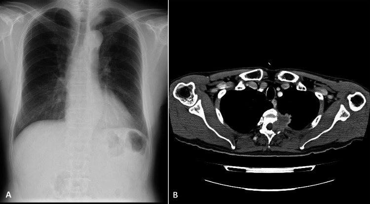 Chest x-ray (A) showing a mass in the left apical area measuring 3 cm in diameter. Contrast-enhanced thoracic CT (B) demonstrating a heterogeneously enhanced mass as large as 3 cm at the apical posterior wall, which partially invaded toward the spinal canal area.