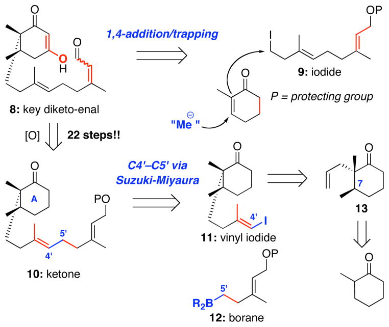 In our initial routes, we exert ed much effort to develop a direct approach toward the key diketo-enal 8 through 1,4-conjugate-addition/trapping with iodide 9 as shown in Scheme 3. However, these efforts did not lead to a fruitful outcome in terms of a concise and stereoselective synthesis of 8.51 Ultimately, in our third generation synthesis, instead of the belt being appended to the cyclohexanyl A-ring portion in a single operation as in the earlier approaches [first and second generations51], it would be stitched together at the C4′-C5′ bond using a B-alkyl Suzuki coupling of vinyl iodide 11 and borane 12. The former would come from 13 derived from a methyl-cuprate conjugate addition followed by trapping with allyl iodide. After these two pieces were joined, we could then investigate oxygenation of the cyclohexanone A-ring in ketone 10 to generate the required diketone motif in 8. These details have been described in our preliminary communication.47,51 While the entire endeavor took 22 steps from 2-methyl-cyclohexanone, it allowed us to examine carefully the key oxa-[3 + 3] annulation reaction.