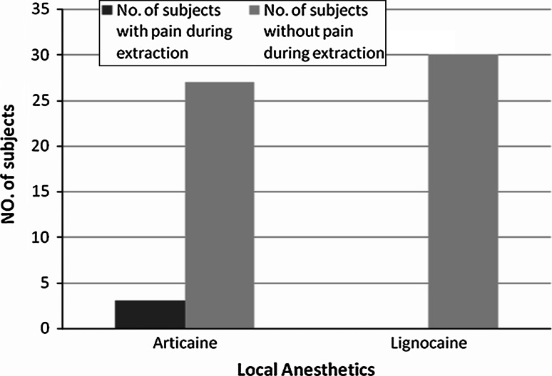 In this study, a total of 30 patients, aged from 10 to 30 years participated. The mean age of the subjects who participated in this study was 17.73 ± 4.30 years. Three subjects in the articaine group aged 21, 26, and 28 years had slight pain during extraction. All the subjects in the lignocaine group had no pain on extraction (Table 1).