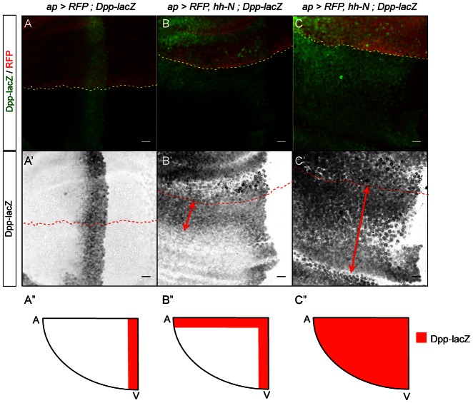 (A–C′) Dpp-lacZ and RFP expression in wing imaginal discs. The expression domain is located above the dashed lines. (A,A′) Control discs. Hh induces Dpp-lacZ in a 15-cell stripe abutting the A/P border. (B,B′) ap-Gal4, UAS-RFP, UAS-hh-WT discs. Ectopic Dpp-lacZ is detected at a 15-cell range (arrows). (C,C′) ap-Gal4, UAS-RFP, UAS-hh-N discs. Dpp-lacZ is detected throughout the anteroventral quadrant (arrows). (A″–C″) Schematics representing anteroventral quadrants of the above genotypes. Ectopic Dpp-lacZ is in red. Scale bars: 10 µm.