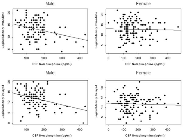 Scatter plots with fitted line showing the association between CSF norepinephrine concentration and Logical Memory Immediate and Logical Memory Delayed Recall, by gender. Lower scores in these tasks reflect poorer performance. Abbreviation: CSF, cerebrospinal fluid.
