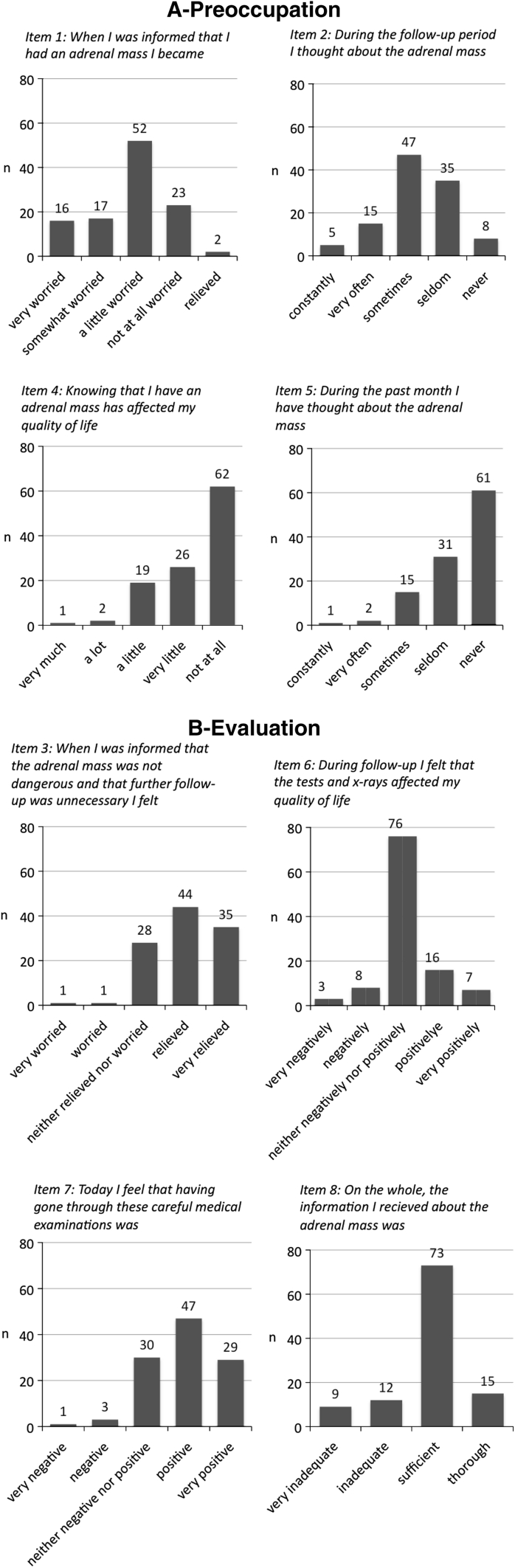 The adrenal incidentaloma impact questionnaire, distribution of responses for each item. Items grouped according to the factor analysis. a Preoccupation with the adrenal incidentaloma. b Evaluation of the follow-up programme