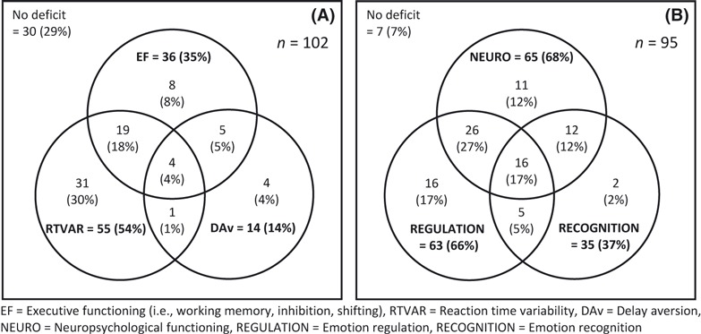 Figure 1(A) presents a Venn diagram showing the overlap between different types of neuropsychological impairment. To simplify the presentation of this categorical data, a mean value was computed for executive functioning. The results showed that 71% of the children with ADHD were shown to have at least one type of neuropsychological impairment: executive functioning (35%), RT variability (54%), and delay aversion (14%). Only four children were shown to have impairments in delay aversion that did not overlap with impairment in the other two domains. Among the remaining 68 children with impairment in either RT variability or executive functioning, there was a substantial overlap (23 children having deficits in both these functions), but also subgroups with impairment in either executive functioning (13 children) or RT variability (32 children). Among the controls, 26% had at least one neuropsychological deficit.