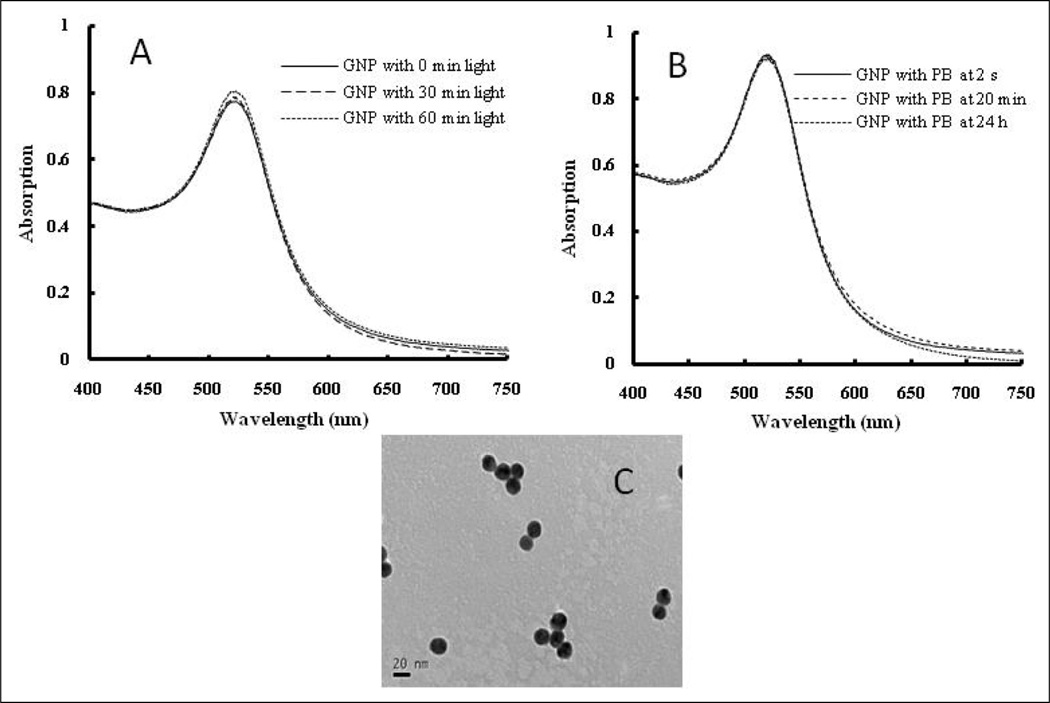Stability of GNPs under light irradiation and in phosphate buffer