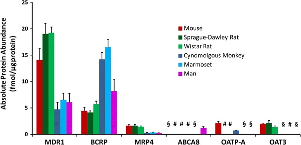 For substrates of drug transporters, relationships between transporter activity at the BBB and in in vitro models must be obtained. When the kinetic parameters for active transport of a drug are measured in representative BBB in vitro systems such as BMEC, they are often reported as normalised values to the quantity of protein in the incubation (97). These values can be scaled to whole-brain permeability by multiplying by the amount of microvessel membrane protein in the in vivo BBB (milligrams of protein per gram of brain), which has been measured using quantitative proteomic methods (98). Since this relies on transporter expression and activity levels being the same per unit mass of protein in both in vitro and in vivo, it may be more appropriate to scale based on the expression ratios of individual transporters. Since multiple efflux and influx transporters are known to be present at the BBB and BCSFB, recent focus has been on characterising their absolute protein abundances. It is only within the last few years that sufficiently sensitive techniques have been reported to successfully quantify transporter absolute abundances at the in vivo BBB (99). The quantitative proteomics approach developed by Terasaki and colleagues has enabled the comparison of BBB transporter absolute abundances between preclinical species and human, which may help to explain interspecies differences in the brain penetration of certain transporter substrates. BBB protein biomarkers including drug transporter abundances have been reported for the mouse (100), cynomolgous monkey (101), human (102), marmoset and rat (103). (Fig. 5.) A significant interspecies difference has been observed between the abundance of two major drug efflux transporters, P-gp and BCRP, between small and large species, with P-gp being the more abundant of the two transporters at the rat and mouse BBB, whereas BCRP was more abundant than P-gp at the monkey and human BBB. Therefore, the incorporation of transporter protein abundances into PBPK models will be essential for interspecies translational modelling of drugs which are substrates for these transporters.