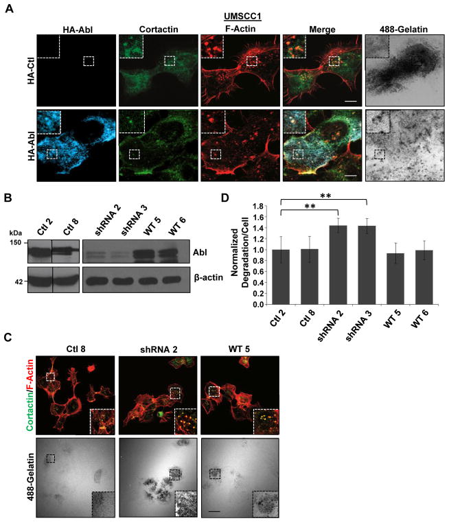 Cells were plated on Oregon Green 488-conjugated gelatin (Invitrogen, Grand Island, NY) coated coverslips (27,87). In cases of inhibitor treatment, cells were allowed to attach for 1 h, then serum starved for 12 h in the presence of 10 μM GM6001 (Sigma) and either imatinib mesylate (LGM Pharmaceuticals, Boca Raton, FL), saracatnib (AstraZeneca, Alderley Park, Cheshire, United Kingdom), gefitinib (AstraZeneca) or SU6656 (EMD). Serum-free media was replaced with complete media containing 10% FBS and kinase inhibitors for 12 h. Cells were rinsed in PBS, fixed in fresh 4% paraformaldehyde and labeled as described (36). Primary antibodies used were anti-cortactin clone 4F11 (1:500), anti-cortactin EP1922Y (1:500; Novus Biologicals, Littleton, CO), anti-cort-pY421 (1:500), anti-Src GD11 (1:500), anti-Abl clone 8E9 (1:200), anti-GFP (1:500; Invitrogen), and anti-HA (1:200). Primary antibodies were visualized using Alexa Fluor 405 and 647 conjugated goat anti-rabbit or anti-mouse secondary antibodies (1:2000; Invitrogen). F-actin was visualized using rhodamine-conjugated phalloidin (1:500; Invitrogen). Cells were mounted with ProLong Gold (Invitrogen) and images were acquired with a Zeiss LSM510 confocal microscope using AIM software (Carl Zeiss MicroImaging, Thornwood, NY). Gelatin degradation was quantified as described previously (87). In brief, ≥ 90 transiently transfected and ≥ 300 lentiviral infected or inhibitor-treated cells evaluated for each condition. For therapeutic treatments and RNAi stable cell lines, the area of degradation and cell area was determined by analyzing the intensity of degraded gelatin or F-actin respectively in an entire field of view utilizing ImageJ software. For transient transfections, the area of degradation and cell area was determined by Image J software on an individual cell basis. The number of invadopodia per cell (n ≥ 50) and number of cells degrading matrix (n ≥ 100) were determined or each independent experiment (n = ≥ 3) (36).