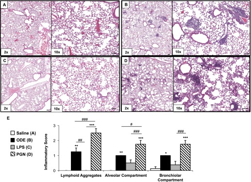 (A–E) Lung inflammation after repetitive treatment with ODE, LPS, and PGN. Mice were intranasally treated with saline control (A), ODE (B, 12.5%), LPS (C, 100 ng), and PGN (D, 100 μg) daily for 3 weeks. A representative 4–5-μm-thick section (hematoxylin and eosin–stained) of one of four mice per treatment group is shown at ×10 magnification (A–D). (E) Mean semiquantitative distribution of inflammatory score of lung lymphoid aggregates, alveolar inflammation, and bronchiolar inflammation in mice (n = 4 mice per group). Error bars represent SEs. Statistically significant differences are denoted by asterisks (*P < 0.05, **P < 0.01, and ***P < 0.001), compared with saline treatment. #P < 0.05, ##P < 0.01, and ###P < 0.001 denote significant differences between groups, as indicated. One-way ANOVA was performed, with Tukey post hoc test comparison. Line scale represents 60 μm.