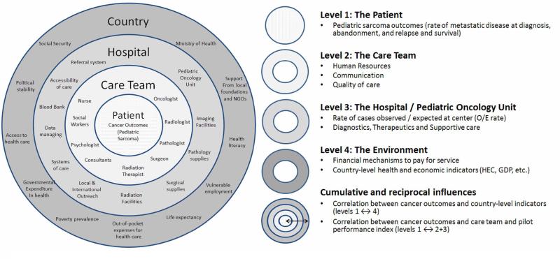 An ecological model centering in pediatric sarcoma and expanding to country as the environment were used as benchmark for studying delivery of solid tumor care in MICs. Data on resources was gathered from seven centers members of the Central American Association of Pediatric Hematologists and Oncologists (AHOPCA) using an infrastructure assessment tool. Pediatric sarcoma outcomes data was available and retrieved from hospital-based cancer registries for six of the seven centers and analyzed by country. Patients diagnosed from 1/1/2000-12/31/2009 with osteosarcoma, Ewing sarcoma, rhabdomyosarcoma, and other soft tissue sarcomas were included in the analysis. In order to explore correlations between resources and outcomes a pilot performance-index was created.