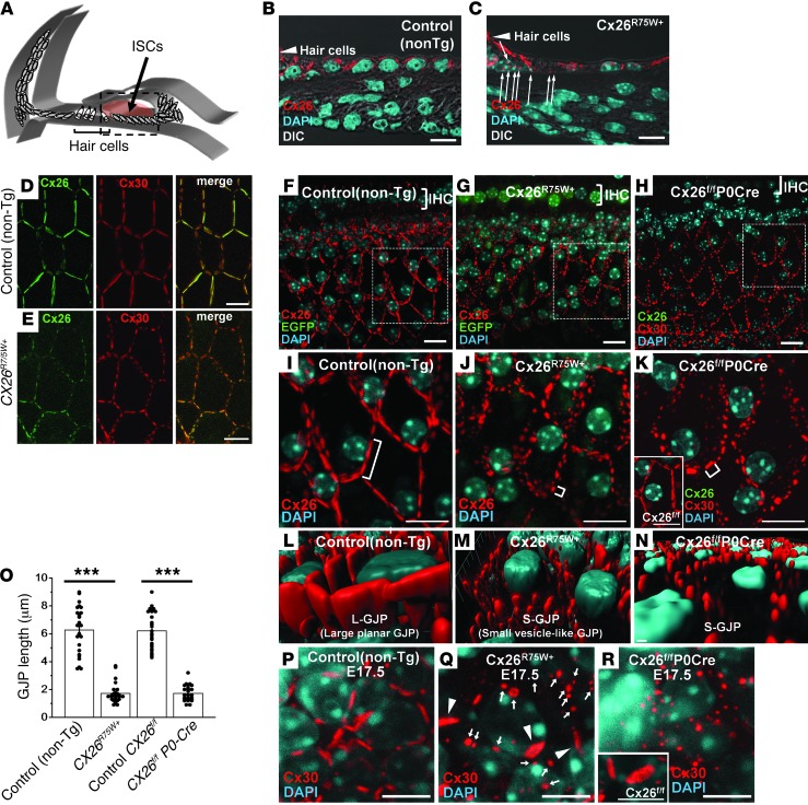 (A) Schematic illustration of cochlear ISCs. (B and C) CX26 distribution (in red) in ISCs (boxed region in A) in P12 cochlear cryosections from CX26R75W+ mice show fragmented GJPs (C, small arrows) in contrast to GJPs in control mice (B). (D and E) Double staining of CX26 and CX30 in whole-mount cochlear tissue at 3 weeks showing that these GJPs are composed of both connexins in control (D) and CX26R75W+ (E) mice. (F–H) GJP formation in 8-week-old adult cochleae from a CX26R75W+ mouse (G), a non-Tg littermate control (F), and a Cx26f/f P0-Cre mouse (H). The partial EGFP signals in G indicate that it is a transgenic animal. (I–K) Image of each boxed region in F–H, respectively. Inset in K shows the GJPs in a Cx26f/f littermate control mouse. (L–N) Three-dimensional images reconstructed from the images in I–K, respectively. (O) Lengths of the largest GJPs (brackets in I–K) along a single cell border (mean ± SE, n = 25 for all four groups). ***P = 4.7 × 10–14 and 1.2 × 10–16 for CX26R75W+ and Cx26f/f P0-Cre cochleae, respectively, relative to controls (Student’s t test). (P–R) At E17.5, CXx26R75W+ ISCs showed a number of S-GJPs (Q, arrows), including some L-GJPs (Q, arrowheads), as observed in the non-Tg control ISCs (P). Cx26f/f P0-Cre ISCs (R) showed totally disrupted GJPs, although the control ISCs (Cx26f/f, inset in R) showed L-GJPs. Nuclei were counterstained with DAPI (blue). Scale bars: 10 μm.