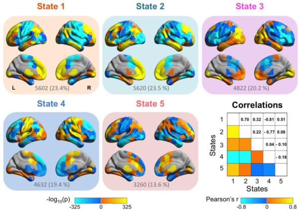 Depicted are the five states identified by hierarchical clustering of iFC windows across seeds and participants over time. For display, the p values of the ROIs exhibiting significant connectivity were −log10 transformed and plotted onto an MNI space surface map in lateral and medial view using BrainNet Viewer (http://www.nitrc.org/projects/bnv/) (L = left; R = right). The total number and percentage of iFC windows belong to each state was listed below each state.