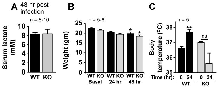 EP3−/− mice exhibit similar degrees of tissue hypoxia and weight loss as wild type mice but have an impaired febrile response to infection. (A) Twenty four hr after infection, serum lactate levels were measured in wild-type (WT) and EP3 knockout (KO) mice. (B) Weights were determined for mice before and 24 and 48 hr after infection. *P < 0.05 compared to basal weight. (C) Core body temperature was measured as detailed in the text for WT and KO mice at time 0 and 24 hr after pneumococcal infection. **P < 0.01 compared to time 0. ns, non-significant.