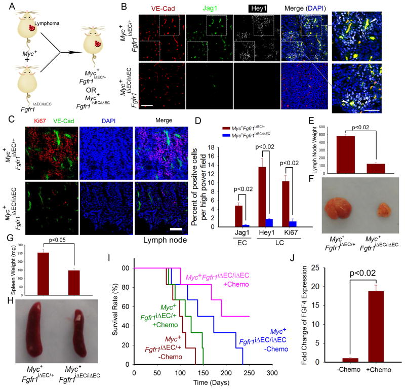 We next crossed Eμ-Myc mice with Fgfr1iΔEC/iΔEC and control mice (Figure 5A) to assess the role of FGFR1 in establishing a malignant vascular niche. Jag1 was preferentially expressed by VE-cadherin+ ECs within the lymphoma of control (Myc+Fgfr1iΔEC/+) mice, but not by ECs of Myc+Fgfr1iΔEC/iΔEC lymphomas (Figure 5B). Complementary expression of Hey1 was seen in the perivascular LCs of control but not Myc+Fgfr1iΔEC/iΔEC mice. As a result, Myc+Fgfr1iΔEC/iΔEC mice survived longer than Myc+Fgfr1iΔEC/+ controls, owing to reduced tumor cell proliferation (Figure 5C–I).