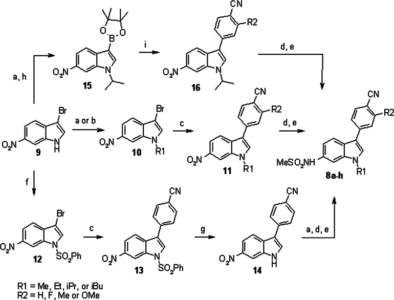 Alternatively, the indole nitrogen could be protected as the phenyl sulfonamide 12 followed by Suzuki coupling and then deprotection of the phenyl sulfonamide with TBAF to give 3-aryl-indoles 14. The indole nitrogen of 14 could then be alkylated followed by reduction of the nitro group and sulfonylation of the subsequent amine to give final compounds 8.