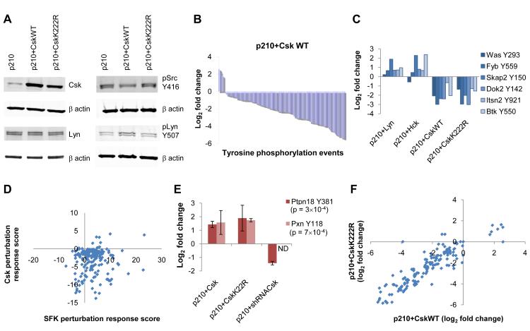 (A) Effects of overexpression of wild-type Csk (CskWT) or kinase-deficient Csk K222R on SFK regulatory phosphorylation events. (B) Ranked log fold changes of tyrosine phosphorylation events (n=99) upon Csk overexpression in the p210 Bcr-Abl Ba/F3 cell line. Changes are relative to p210-expressing cells. Data is representative of one of three replicate experiments. (C) Log fold changes with respect to the p210 background of SFK-dependent phosphorylation events in different perturbation experiments. These SFK events are a subset of those with high SFK perturbation response scores and identified as SFK substrates and interacting proteins (Table 1). (D) The events repressed by Csk overexpression include both SFK perturbation responsive and non-responsive events, as indicated by the lack of correlation between Csk responsiveness and SFK responsiveness (correlation coefficient R=0.08). The Csk perturbation response score is defined similarly to the SFK score but using 3 independently derived replicates of the Csk-overexpressing cell lines (see Materials and Methods). (E) Changes in the phosphorylation of Ptpn18 and Paxillin (Pax) in Csk overexpression and knock-down experiments as measured by quantitative mass spectrometry. Results include two independent hairpins targeting Csk (fig. S9). Error bars are s.e.m. P-values are based on comparisons of the observed replicate fold changes to the background fold change distributions from measuring like biological samples (see fig. S12). ND, not determined. (F) Scatter plot showing the high correlation (R = 0.9) of phosphorylation event fold changes between cells overexpressing either CskWT or CskK222R.